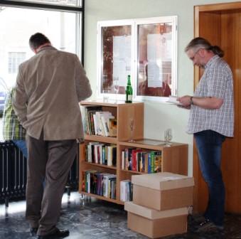 Herr Bürgermeister Bösenecker (li) und SPD-Gemeinderat Jochen Ackermann (re) schmökern schon mal in den ersten Büchern. Unser 1. Vorsitzende Fritz Klenk begrüßte bei der kleinen Feier zur Einweihung des öffentlichen Bücherregals, neben einigen Mitgliedern und SPD-Gemeinderäten auch den Hausherren Herrn Bürgermeister Joachim Bösenecker.